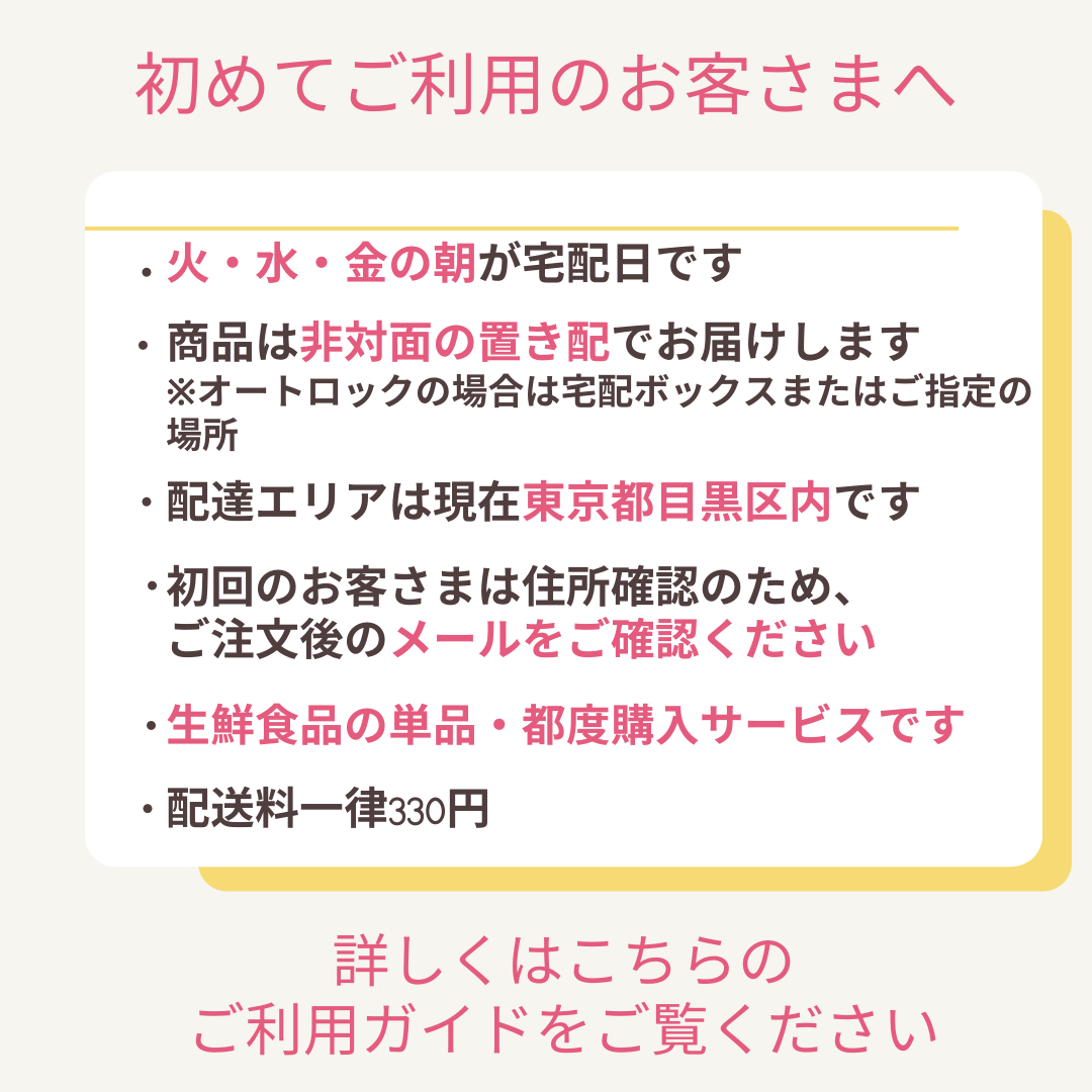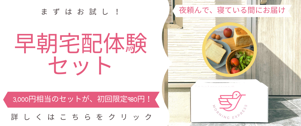 「まずは早朝宅配を体験してみたい!」というお客様に向けて、早朝宅配体験セットをご用意しました。「朝届くってどんな感じ?」「朝の置き配ってちょっと心配」など、お届け方法がわからず不安な方は、大変お得なこのセットをぜひお試しください。 <ご案内①> 朝に届いてちょうどいいアイテムを中心に、3000円相当を980円でご利用いただけます。 セット以外のアイテムも同じ送料で一緒にお届けできますので、ぜひ他の商品もご覧ください。 2回目以降は、ご希望の商品のみ単品・都度購入でお求めいただけます。 ※モーニング・エキスプレスは、月額制セット販売ではなく、ご希望の商品を単品・都度購入いただけるサービスです。 <ご案内②> 【必ず入れて欲しいアイテムを、<種類を選択する>から1つお選びください】 選択したアイテムに加えて、届いたらすぐ食卓に出せる商品をメインに、時期に合わせたアイテムを組み合わせます。 早朝宅配体験セット例: ・パン:食パンまたは惣菜パン ・乳製品:ヨーグルト、牛乳等 ・ハム、ベーコン等 ・惣菜/デリ ・野菜 ・フルーツ ・ドリンク:コーヒー(レギュラー/デカフェ)、紅茶、野菜ジュース、フルーツジュース ※セット内容は仕入れにより変更する場合があります。 <ご案内③> 初回ご注文時のみにお届け方法に関するアンケートをメールにて送付させていただきますので、 ご回答をお願いいたします。 ※初回の方以外はご注文できませんのでご了承ください ※同一住所につき1回・1点のみ、ご利用できます ※ご家族用(3名程度のサイズ) ※内容物に応じてお届けの際の荷物の個数が変わります。現在は、白地の箱でお届けしています。 お選びいただいた商品に加えて、下記カテゴリーの商品から弊社お任せのアイテム数点が入ります。入荷に応じて、内容は異なります。内容は弊社にお任せになります。